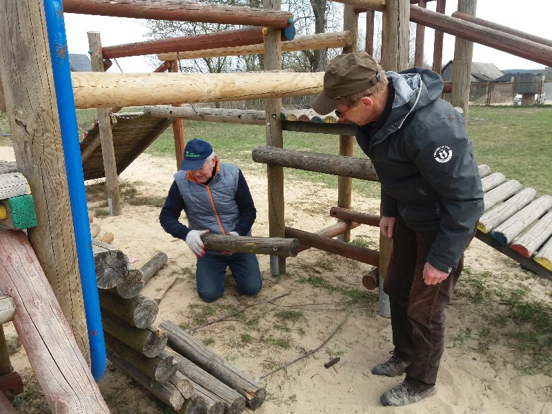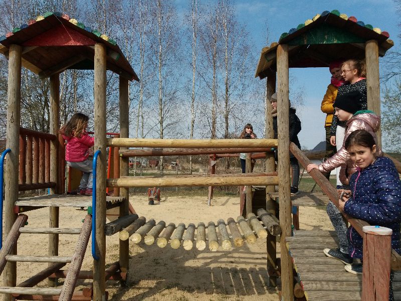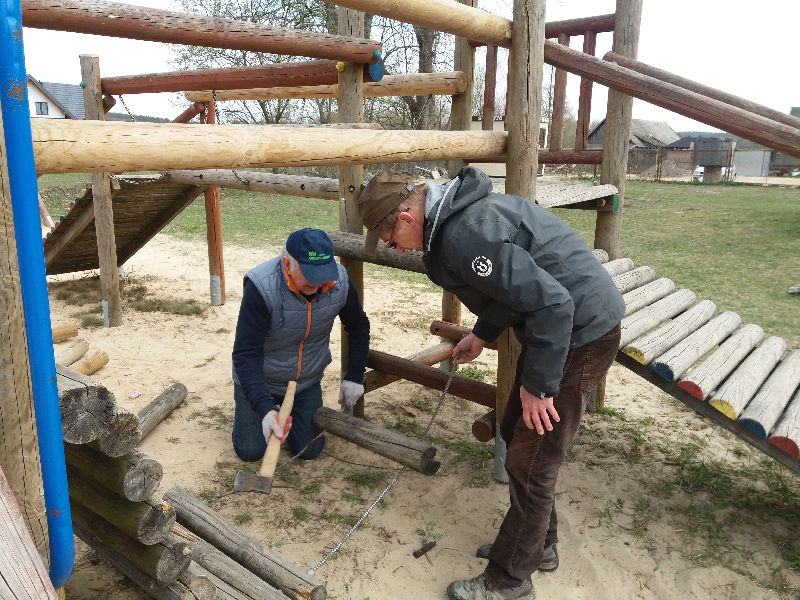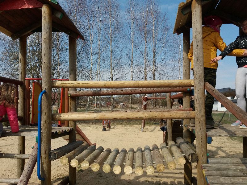 Plac zabaw wzbogacił się o dwa nowe przyrządy – drabinkę poziomą oraz karuzelę twist. Dzisiaj też staraniem mieszkańców został naprawiony mostek w „starej” drewnianej zabawce. Bardzo chętnie skorzystamy z pomocy innych tatusiów i dziadków przy montażu i naprawie przyrządów na placu zabaw. Dużo dzieci korzysta z placu zabaw…