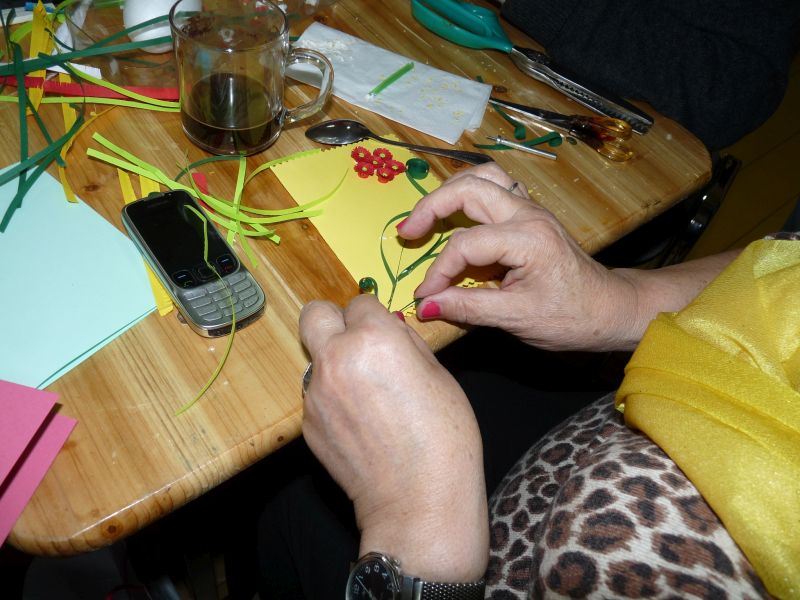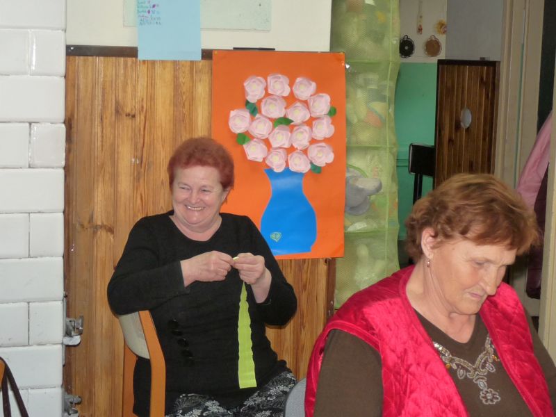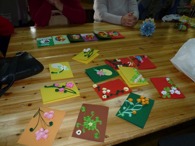 Dzisiaj głównie robiliśmy pocztówki, pisanki metodą decupage oraz uczyłyśmy się wyczarowywać nowe rodzaje kwiatów z bibułki, których mistrzynią jest Zina z Supraśla.
