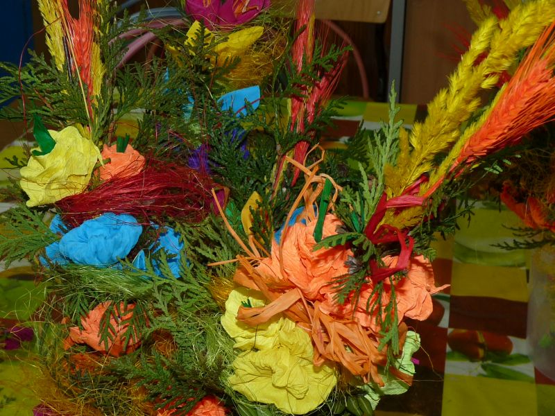 Na początku był chaos, ludzi przybywało, a my ciągle donosiliśmy stoły i krzesła. Jak już wszyscy się umościli na swoich miejscach, to przyjechała Renata z Nowodworc z komponentami. No i zaczęło się. Zaczęliśmy robić kwiatki, komponować tujki, bukszpany z bibułkami, łączyć to z kłosami. W ten sposób na koniec wyczarowaliśmy całkiem ładne (w naszej ocenie) palmy. Oceńcie sami, trochę zdjęć prezentuję w galerii. Ponad dwie godziny zajęć minęły nie wiadomo kiedy. Przygotowane na warsztaty smakołyki (ciasta, ciasteczko, chleb własnego wypieku), nie było po prostu czasu zjeść.
