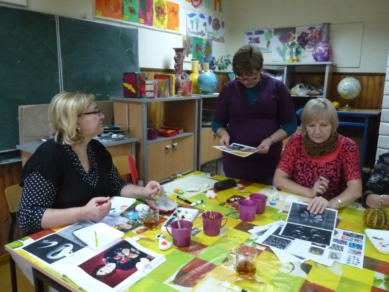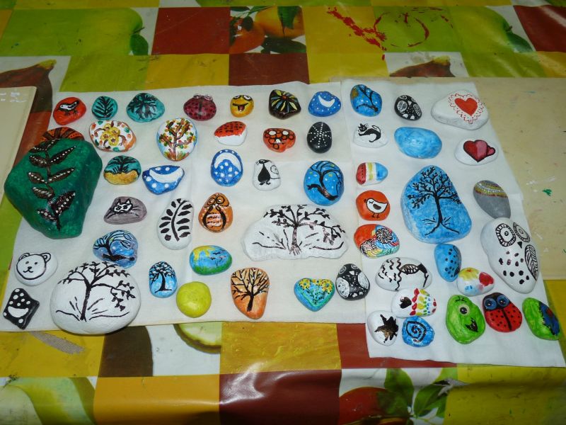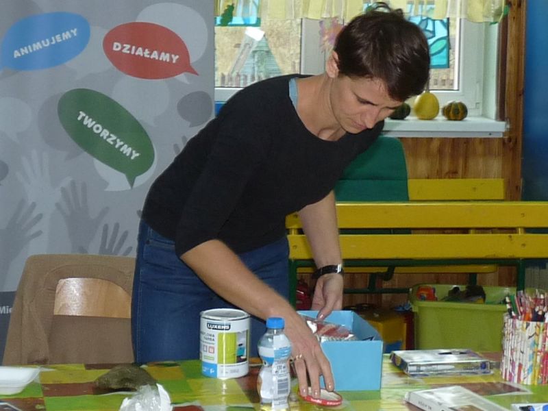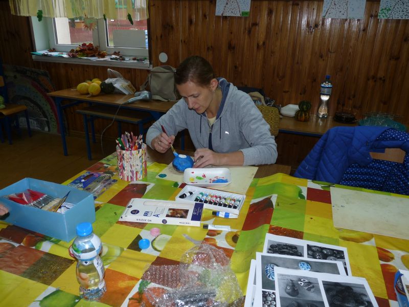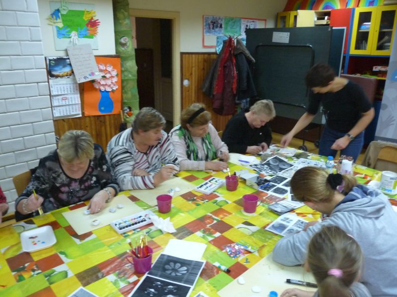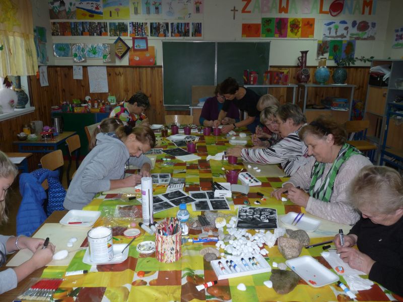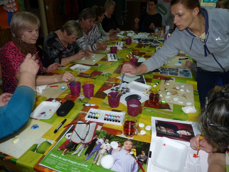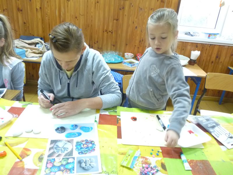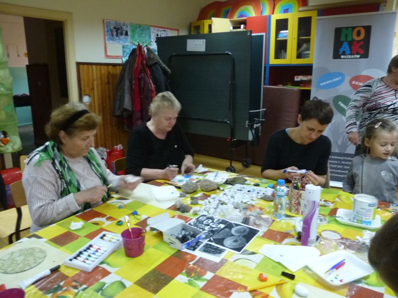 Znalazłyśmy metodę na jesienną chandrę – spotykamy się w świetlicy i … tworzymy. Dzisiejsze spotkanie było pierwszym z cyklu, taką przynajmniej mamy nadzieję. Planujemy spotykać się raz w miesiącu na warsztatach międzypokoleniowych. Dzisiejszym tematem przewodnim były kamienie. Na polnych kamykach tworzyłyśmy w naszym mniemaniu małe dzieła sztuki. Dzięki finansowemu wsparciu MOAK’u przez dzisiejszy proces tworzenia przeprowadziła nas pani instruktor, która potrafiła każdemu niesprecyzowanemu do końca pomysłowi artystycznemu nadać realny kształt.
