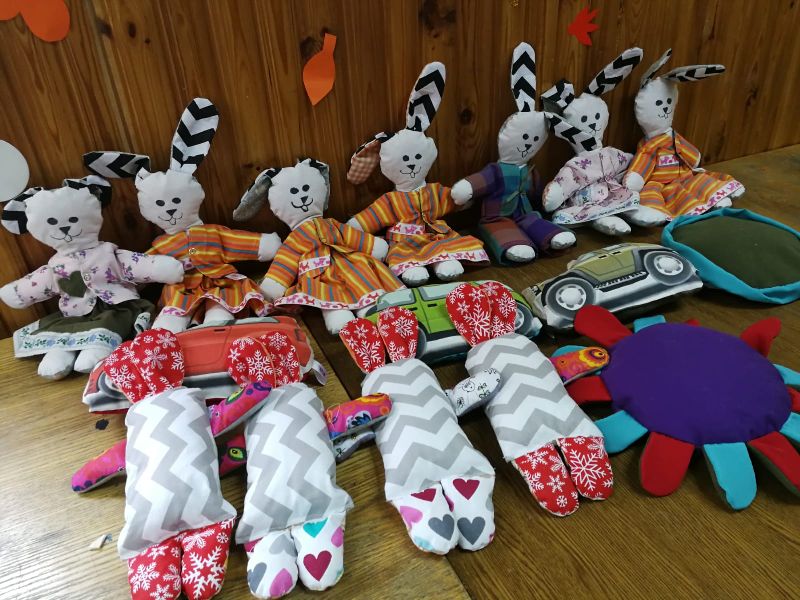 Tym razem robiłyśmy maskotki, które przekażemy Fundacji wspierającej chore dzieci w szpitalach. Szyły głównie Ula i Ania, reszta pomagała. Zosia liczyła i układała gotowe „produkty” do pudełek..