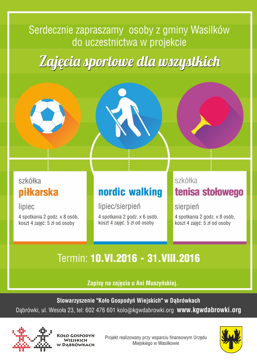 10 czerwca 2016 r. rozpoczęliśmy realizację zadania publicznego „Zajęcia sportowe dla wszystkich” wspieranego przez Burmistrza Wasilkowa. Zakończenie projektu przypada na 31 sierpnia 2016 r.