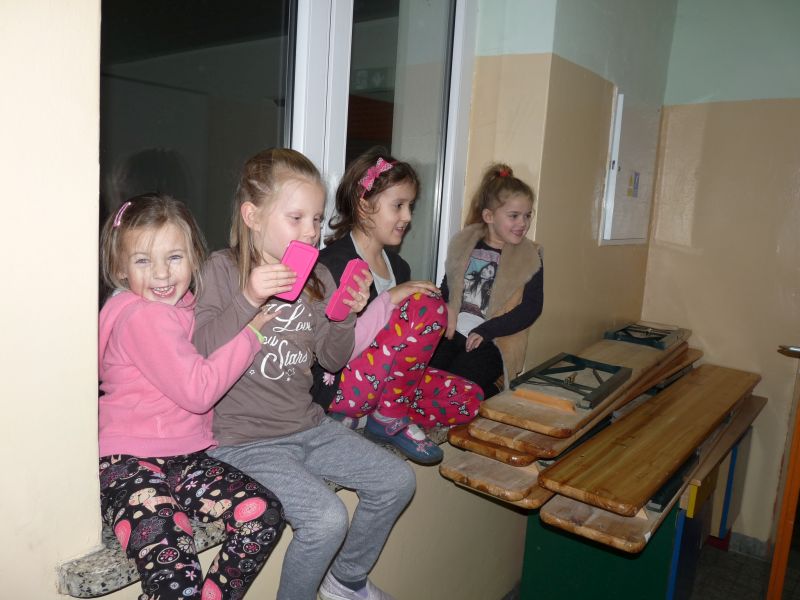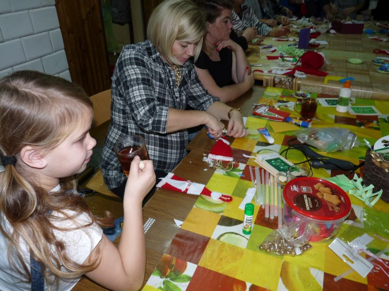Jako że warsztaty były rodzinne, więc były mamy z dziećmi i babcie. Na początku wszyscy razem robiliśmy ozdoby pod dyktando pani Ani , ale po godzinie dzieci po cichutku wycofały się z zajęć warsztatowych i przeniosły się do pozostałych pomieszczeń świetlicy. I wówczas cichutko już nie było. Dzieci samoistnie podzieliły się na grupy wiekowe i „szalały” w podgrupach, co będzie widać na zdjęciach. Wyglądały na bardzo zadowolone. Dzięki warsztatom nie tylko powstały ozdoby świąteczne, ale była też okazja do integracji sąsiedzkiej (Wasilków-Dąbrówki-Studzianki) zarówno wśród dorosłych jak i dzieci.