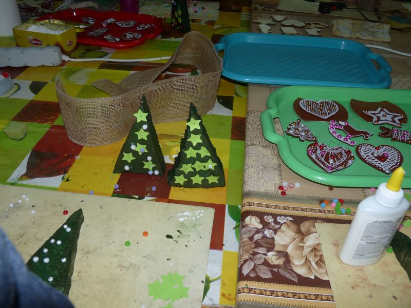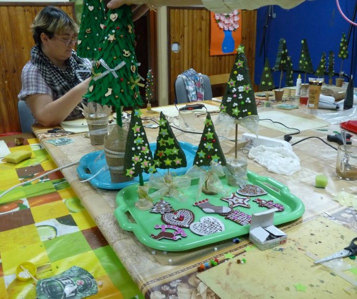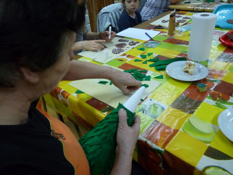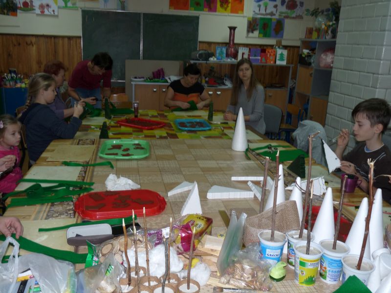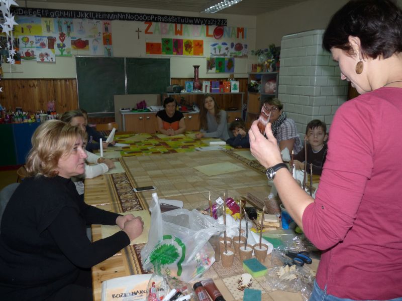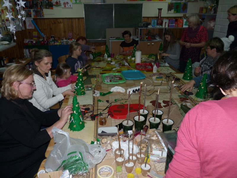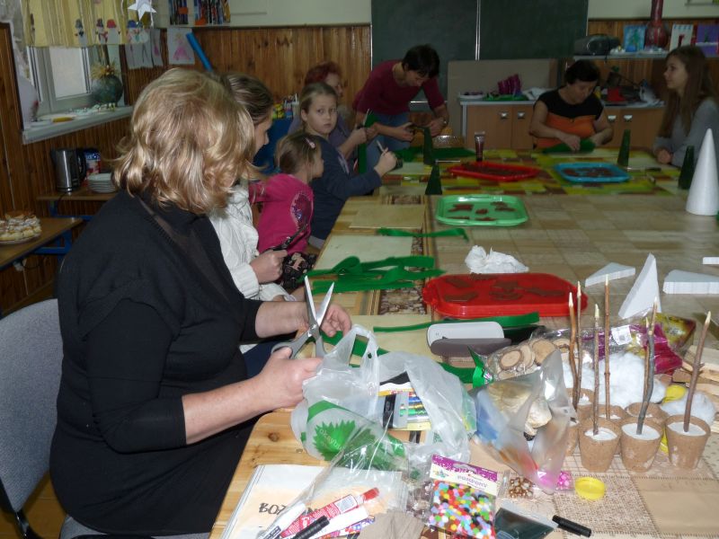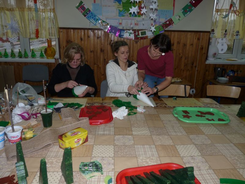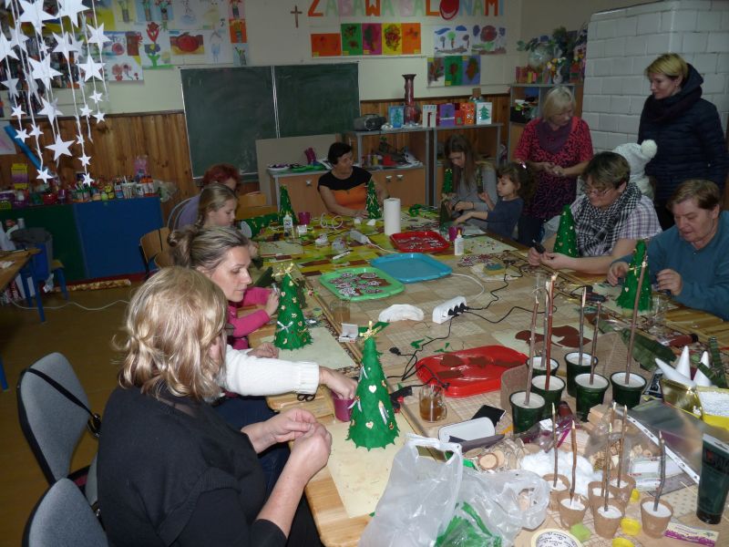 Kolejne zajęcia zrealizowane w ramach zadania Razem, to zajęcia kreatywne. Tym razem robiliśmy choinki oraz zawieszki, bądź magnesy o tematyce świątecznej. Na zdjęciach widać jak stoły przy których pracujemy zapełniają się kolejnymi pracami i półproduktami, aż pod koniec zajęć zamieniają się niemalże w prawdziwy las. A pomiędzy choinkami niczym polukrowane pierniczki leżą zawieszki i magnesy. 4 godziny zajęć minęły jak jedna chwila i wszystkie panie stwierdziły, że było to znacznie przyjemniejsze zajęcie niż co sobotnie sprzątanie i kucharzenie. Dzieci też były bardzo zaangażowane w wykonywane prace, co widać na zdjęciach.