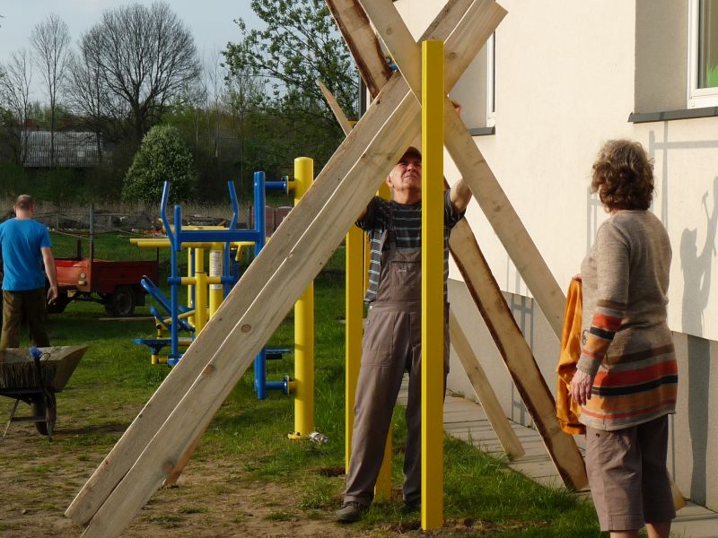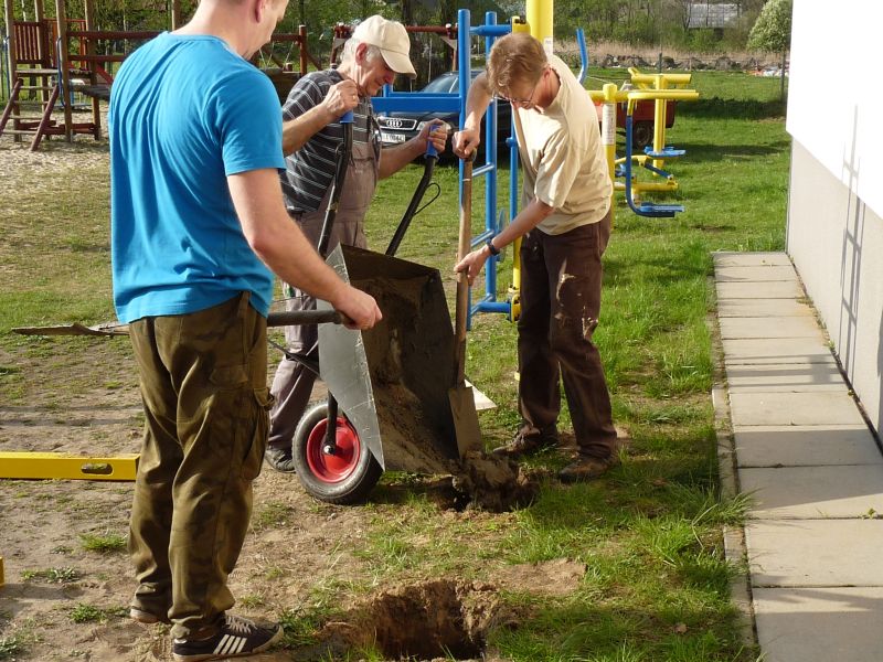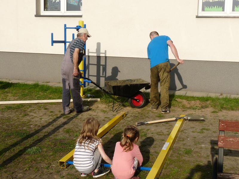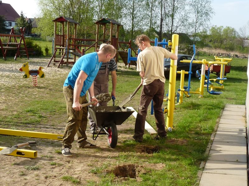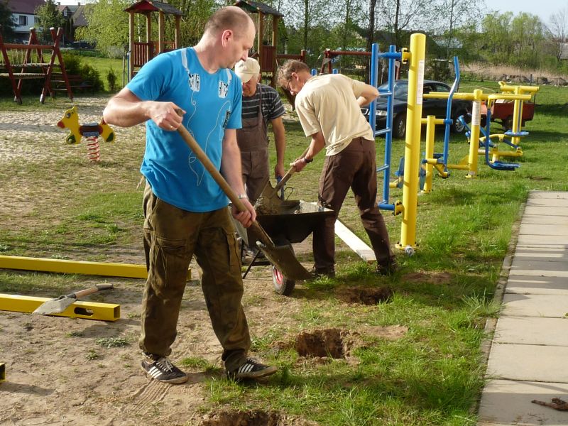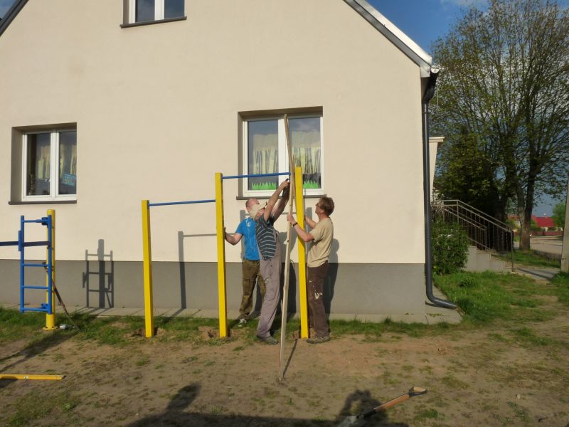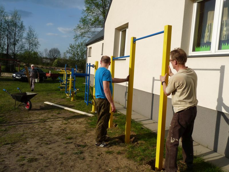 Dzisiaj (6/5/17), przy pięknej pogodzie zainaugurowana została realizacja funduszu sołeckiego 2017 roku. Jako pierwszy został wykonany montaż i mocowanie drążków.Dzięki temu mamy na placu zabaw nową „zabawkę”, która pomoże w dbaniu o nasze zdrowie i sprawność.